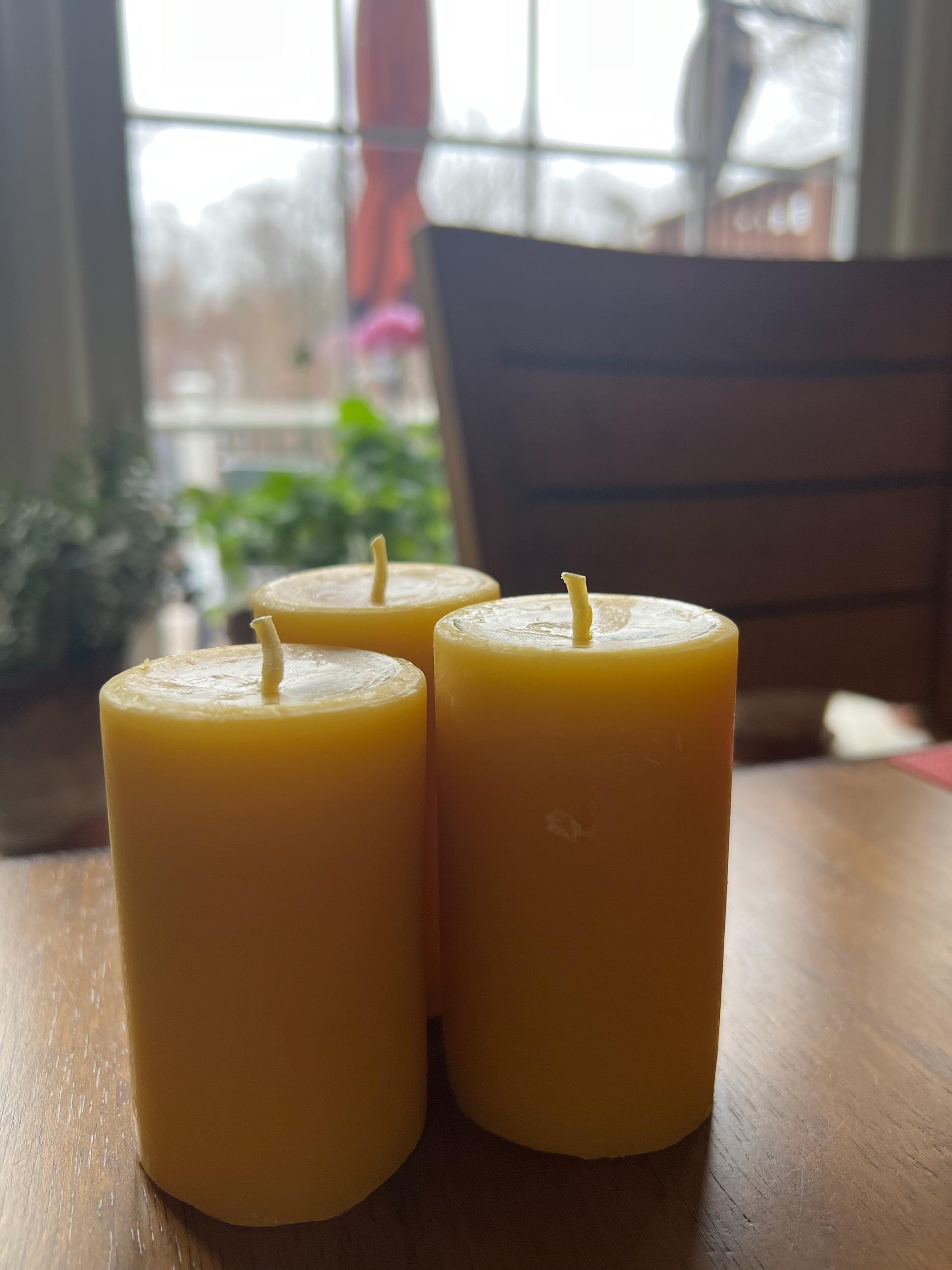 100% Pure Beeswax Pillar candles. 2" in diameter and up to 8" tall Natural Honey, Heilala Vanilla, Ceylon Cinnamon or lemon scented